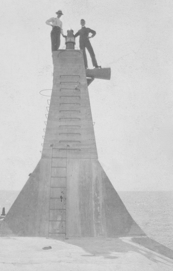 Work on the harbour’s outer breakwaters began in 1904 and necessitated the erection of a new back light, 254 feet north of the north pier, to form a proper range for avoiding these offshore obstructions. This light was initially just a lantern hoisted atop a mast, but in 1908, a three-section, skeletal, steel tower, which had a height of sixty-four feet, was erected in its place. In 1909, a reinforced concrete, gas-lighted beacon, with a height of fifteen feet, was established on the western end of the north breakwater.