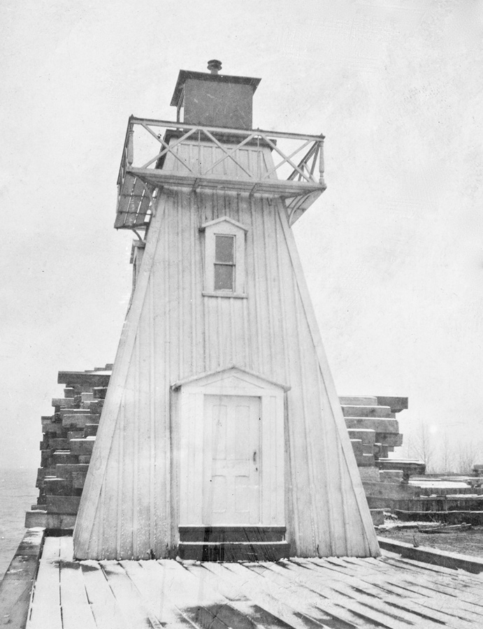 By 1867, two lights had been established on the north pier. Responsibility for these lights was transferred from the Department of Public Works to the Department of Marine in 1875, and George N. McDonald, keeper of the main light, was paid an extra $100 each year to look after the pier lights. An elevated walkway was added to the north pier in 1878 to help the keeper reach the piers lights in stormy weather.