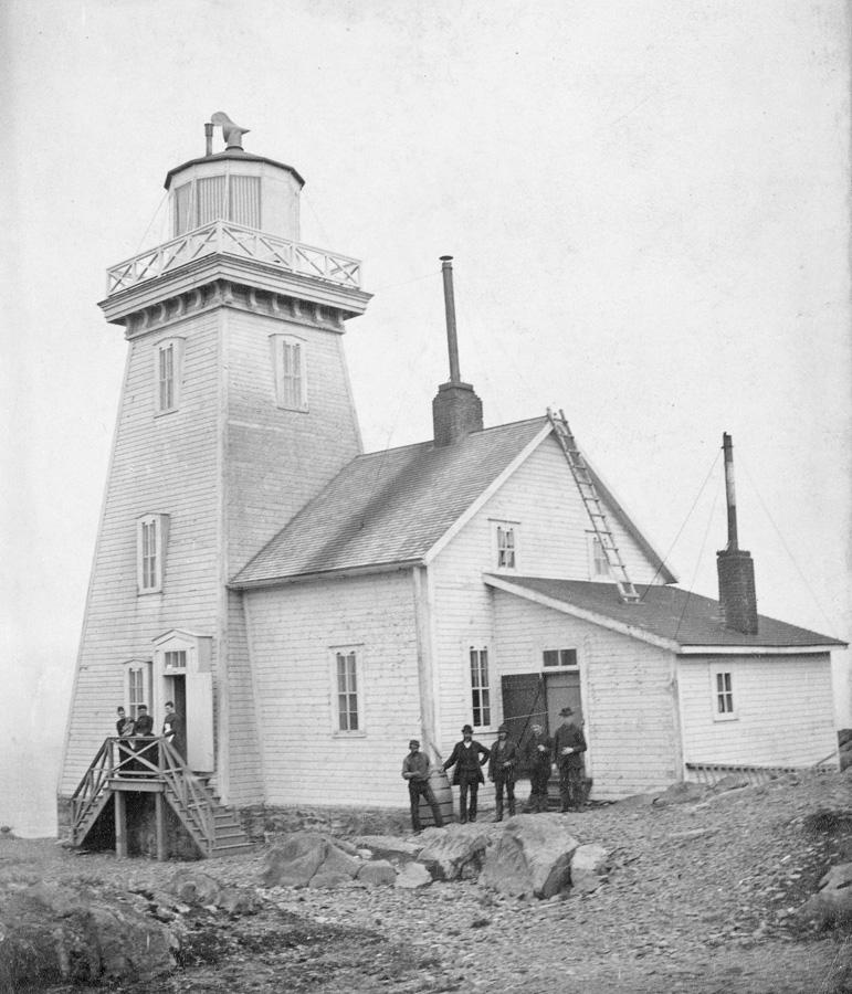 Built of wood, the lighthouse consisted of a square, sixty-foot tower attached to a keeper’s dwelling. A revolving catoptric lighting apparatus was used in the lantern room to produce alternating red and white flashes, spaced by forty-five seconds. The light had a focal plane of 141 feet above high water and could be seen for up to eighteen miles. The foghorn, operated by compressed air, was located in a building about 150 feet from the lighthouse. This signal produced a ten-second blast in each minute when needed. The total amount expended for the work was $8,675.71, and Alexander St. Laurent was appointed keeper at an annual salary of $800, out of which he was required to hire a “duly qualified assistant.”