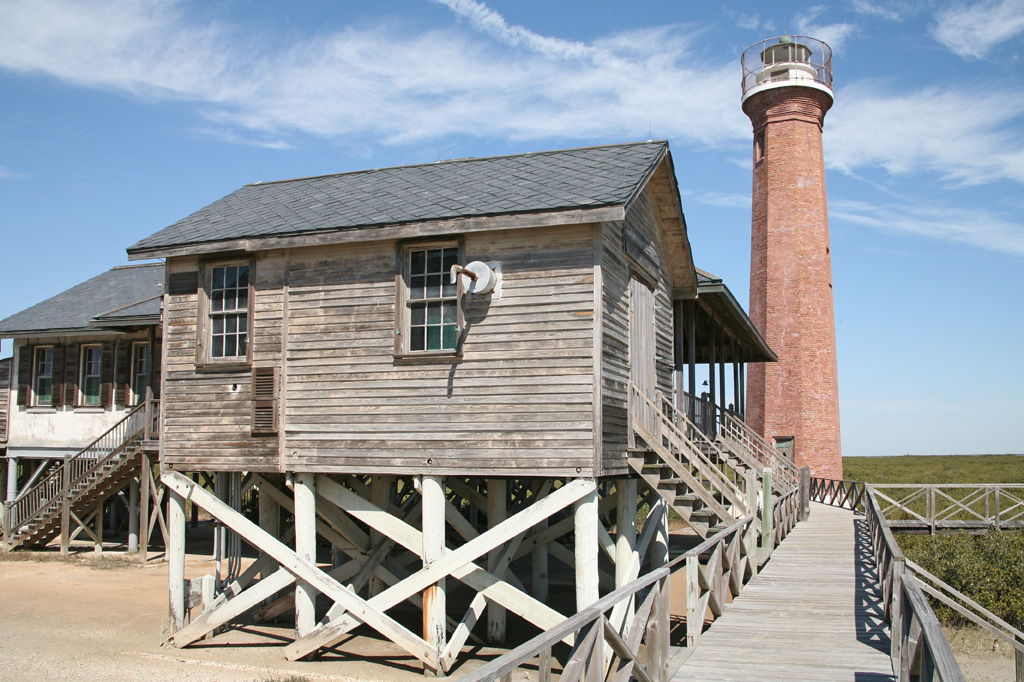 A double-dwelling of hollow-tile construction was built about thirty feet southwest of the lighthouse atop twenty cast-iron columns that were each supported by a concrete footing that capped a nineteen-foot yellow-pine pile driven into the marsh. The dwelling had three rooms in each of its two apartments and its roof extended out over a wrap-around porch. Detached kitchens were built behind the dwelling and were linked to it by a four-foot-wide covered gallery. Facilities, in the form of a two-compartment, frame privy set atop a brick foundation supported by a creosoted pile foundation, were also separate from the dwelling. A thirty-foot-long and six-foot-wide wharf was built parallel to the nearby bayou, and a five-foot-wide walkway that was roughly 270-feet-long connected the wharf to the dwelling, oil house, and tower.