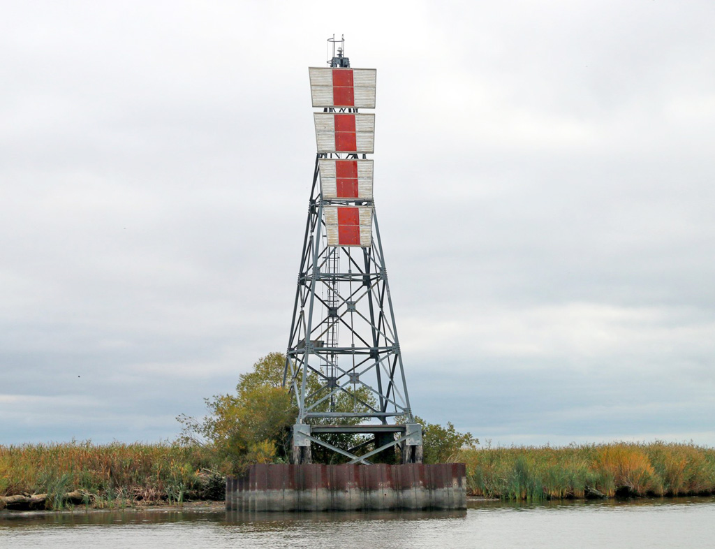 Modern towers were placed at the entrance to Red River in 1992. These range lights served until 2019, when the front light was discontinued and the rear light was renamed Red River Mouth Light. This light is a flashing white light displayed from a skeletal tower.