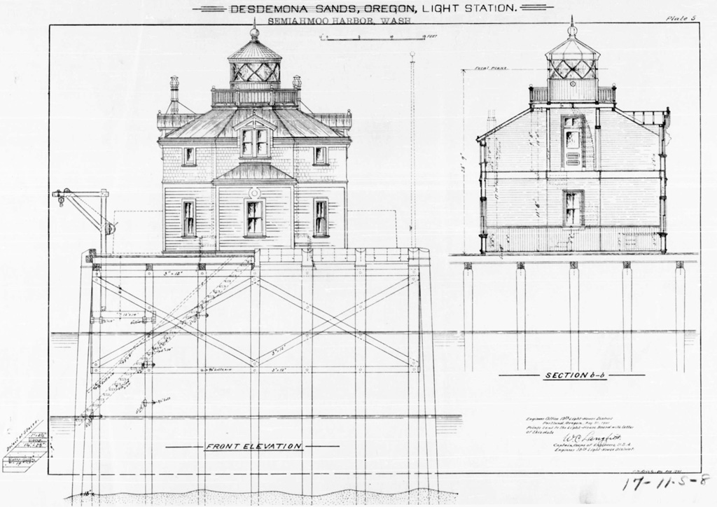 German-born architect Carl W. Leick, employed in the district offices of the Lighthouse Service in Portland, had drawn up plans for an octagonal lighthouse built atop a pile foundation for Willamette River Lighthouse in 1895. He modified and enlarged this design for Desdemona Sands Lighthouse, and these plans were then reused for Semiahmoo Lighthouse, as evidenced by “Desdemona Sands, Oregon” being struck through and replaced with “Semiahmoo Harbor, Wash.” on the drawings. The one-and-a-half-story, octagonal structure had a kitchen and fog-signal engine room on the main floor, three bedrooms and a storeroom on the upper story, and was attached to a rectangular, one-story structure that contained a fuel room, oil room, and privy. Two circular tanks on the platform held the station’s water supply.