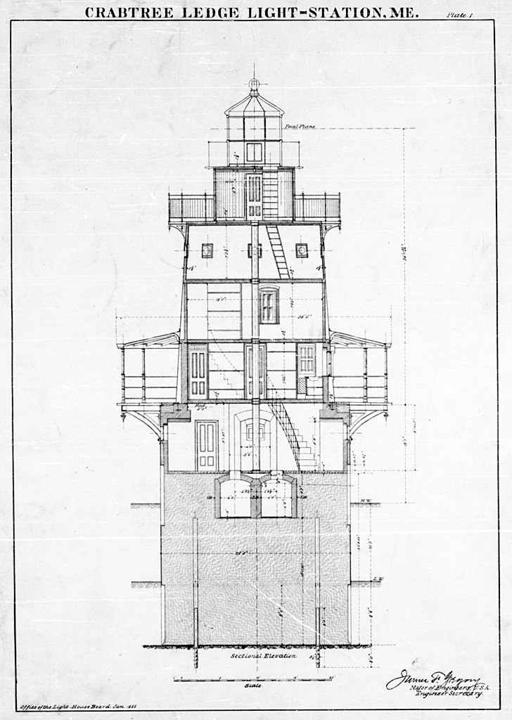 Crabtree Ledge Lighthouse consisted of a cylindrical iron caisson, twenty-five feet in diameter and thirty-two feet high, founded upon rock fifteen feet below mean sea level and filled with concrete. Above this rose a conical iron tower surmounted by a black lantern. The focal plane stood fifty-four feet above mean sea level.