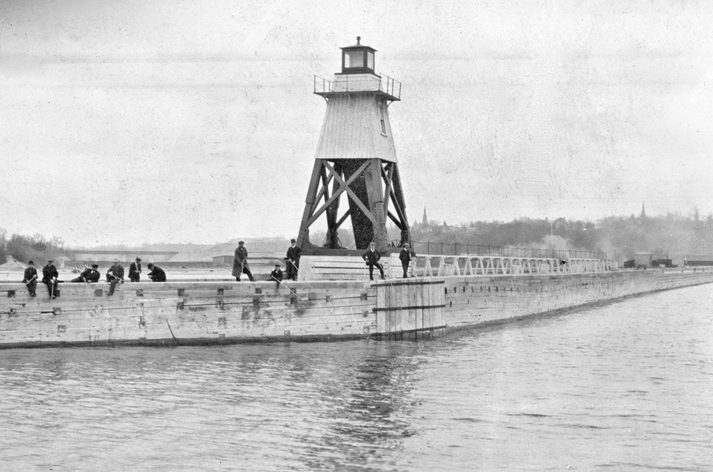 By 1867, two lights had been established on the north pier. Responsibility for these lights was transferred from the Department of Public Works to the Department of Marine in 1875, and George N. McDonald, keeper of the main light, was paid an extra $100 each year to look after the pier lights. An elevated walkway was added to the north pier in 1878 to help the keeper reach the piers lights in stormy weather.
