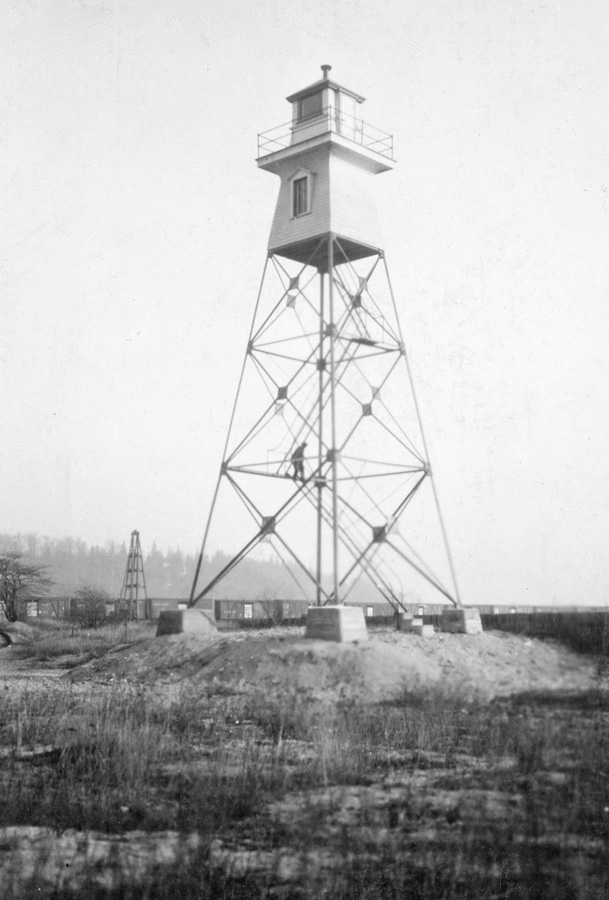 Work on the harbour’s outer breakwaters began in 1904 and necessitated the erection of a new back light, 254 feet north of the north pier, to form a proper range for avoiding these offshore obstructions. This light was initially just a lantern hoisted atop a mast, but in 1908, a three-section, skeletal, steel tower, which had a height of sixty-four feet, was erected in its place. In 1909, a reinforced concrete, gas-lighted beacon, with a height of fifteen feet, was established on the western end of the north breakwater.