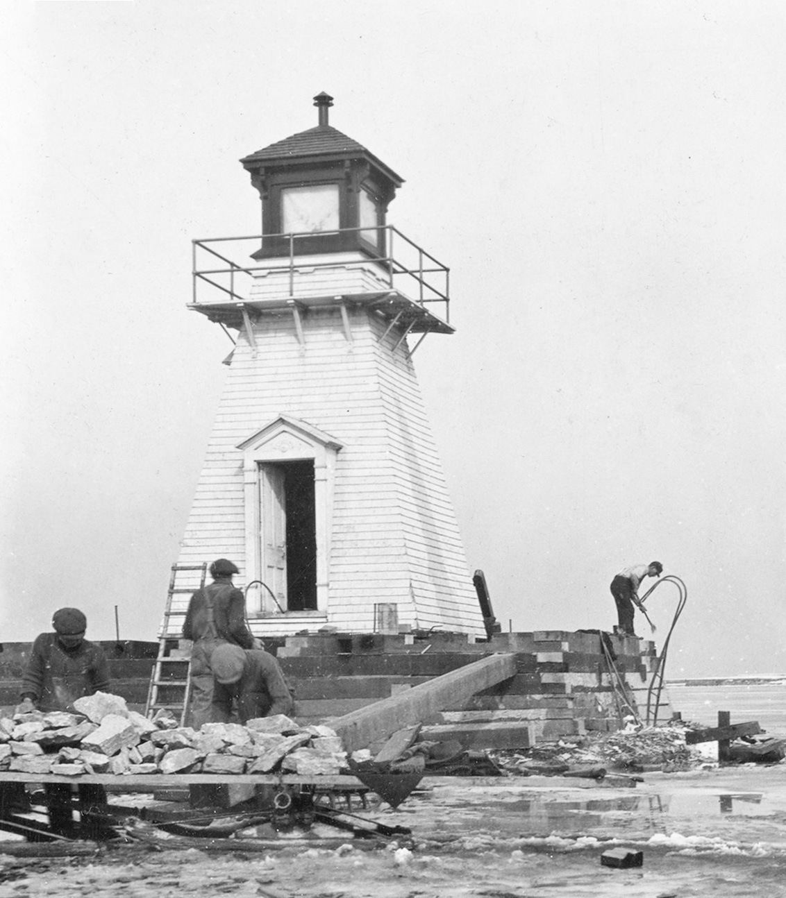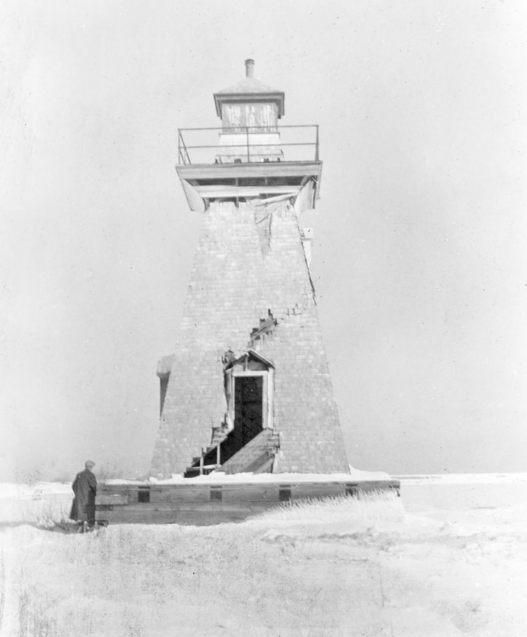 The history of lighthouses at Collingwood began in the 1800s when the Northern Railway of Canada built a harbour light there. In 1877, the government of Canada assumed responsibility for the light and appointed Robert Doherty its keeper at an annual salary of $200. This early lighthouse was a white, wooden tower with a wooden lantern that had a diameter of six feet and was situated on the breakwater. When Keeper Doherty died in 1881, the government appointed William Bishop as the next keeper.