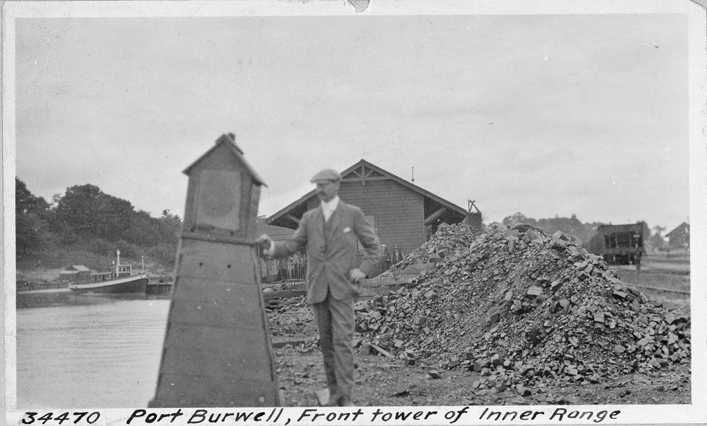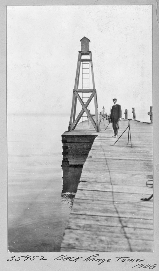 The Department of Public Works extended the breakwater piers at the entrance to the harbour at Port Burwell in 1899, and the Pennsylvania-Ontario Transportation, which operated a railroad car ferry between Ashtabula, Ohio and Port Burwell, established a pair of range lights on the east pier in 1906 to mark the harbour. In 1910, the Department of Marine assumed responsibility for these range lights, which were fixed white and shown from reflector lanterns mounted atop wooden frameworks.