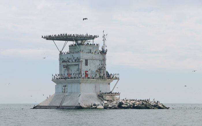 The Detroit River Construction Company of Windsor, Ontario began work in 1925 on a combined reinforced concrete dwelling, fog alarm, and lighthouse atop a cribwork pier. Under the $134,620 contract, the timber crib was built in Kingsville, towed to the shoal, and then sunk in twenty feet of water. After workers filled it with ballast, the crib was topped by a concrete deck that tapered inward for several feet before rising to support the deck for the lighthouse.