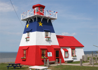 The faux lighthouse at Grande Anse was painted in the colours of the Acadian flag in 2001. Before that time, it was white with a red lantern and red trim, and a couple of large red question marks on its sides indicated the purpose of the structure.