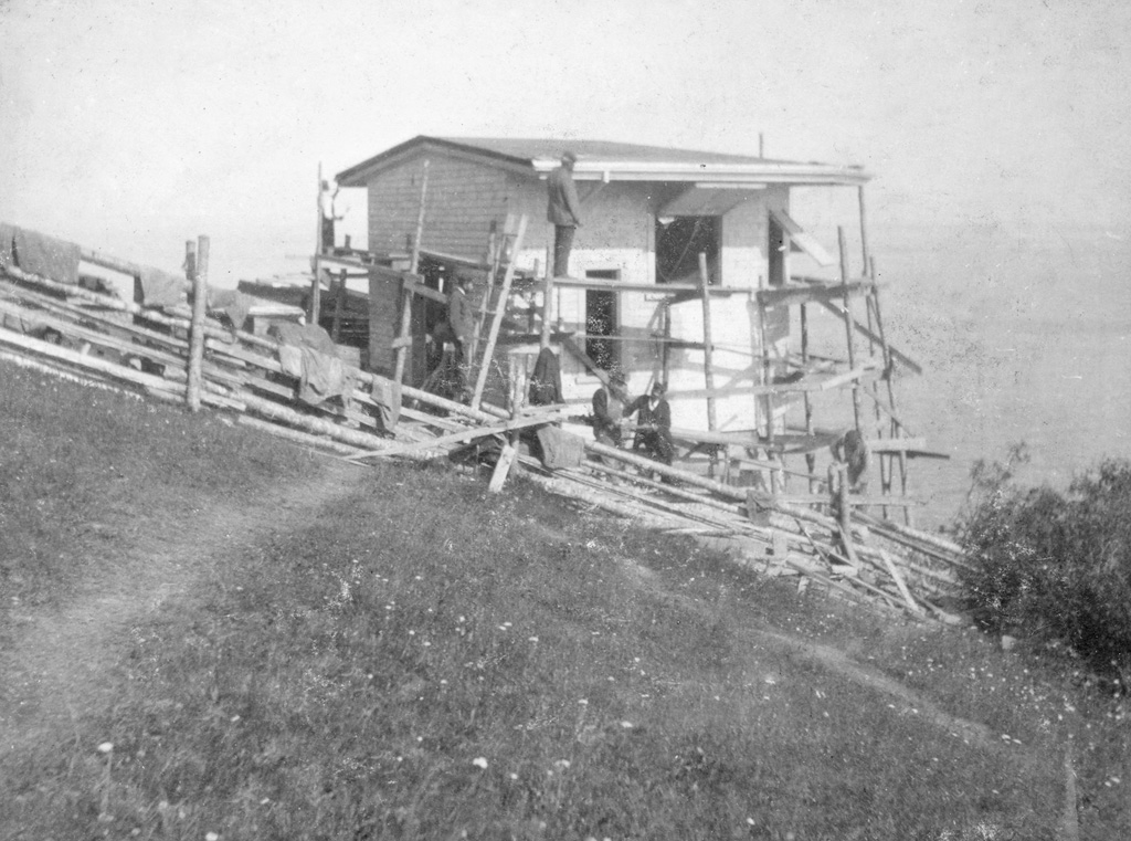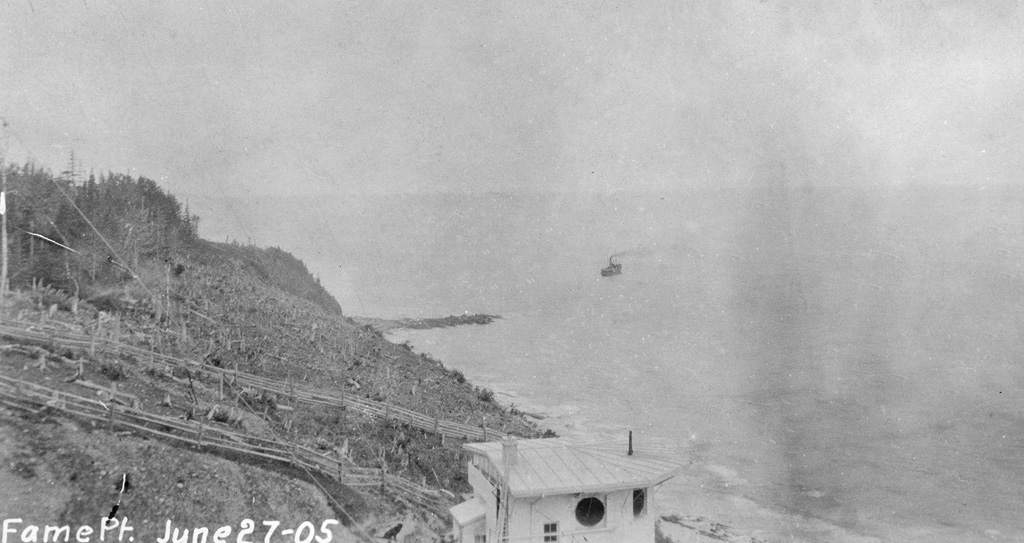In 1902, a small wooden building with a flat roof was built at the edge of a cliff, 180 feet northwest of the lighthouse, to house a Hamilton-Foster fog siren made in New York. This signal commenced service on October 8th of that year and gave blasts through four megaphones, pointed north, northeast, east and southeast, in the following succession: