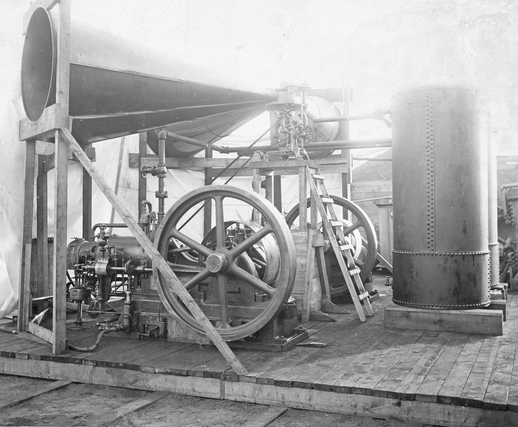 This unique method of sounding the fog alarm was set up as an experiment to determine if mariners could calculate their bearing from the station by the relative audibility of the various signals. If a mariner heard the single blast loudest, or heard only a single blast, the siren should be located due south of him. Similarly, if the two short blasts are the loudest, the signal is southwest of the mariner, and so on for the other signals. The experiment was likely not too successful as in 1905 a new fog alarm building was built, fifty feet southeast of the lighthouse, and equipped with diaphone machinery. Water for the new boilers was piped from a lake near the station. The diaphone signal commenced operation in 1906, giving a four-second blast in each minute.