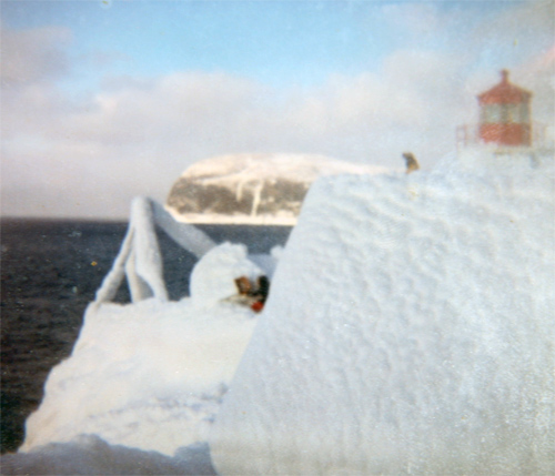 When they got outside they could not believe their eyes. There was 4-5 feet of ice covering the entire light station. Due to the strong winds that night, they were unable to communicate to Corner Brook on the VHF radio since the antenna had gotten torn off the building. They would normally make contact with Comer Brook 3 times per day. It took all day to repair the antenna so they could contact Corner Brook and inform them of the icing of the building. After several days when the weather improved, several men from Lark Harbour came to help them chop away all of the ice covering the entire station. It took a full week to remove all of the ice from the buildings. This was one of many such ice storms that occurred at South Head. The light station is now automated and the only thing left at South Head is the actual light.