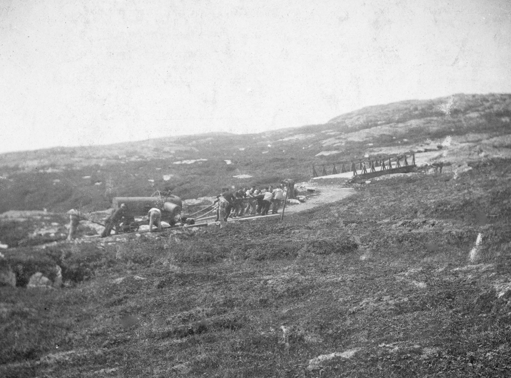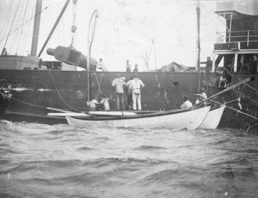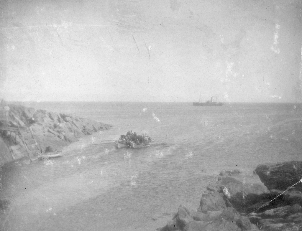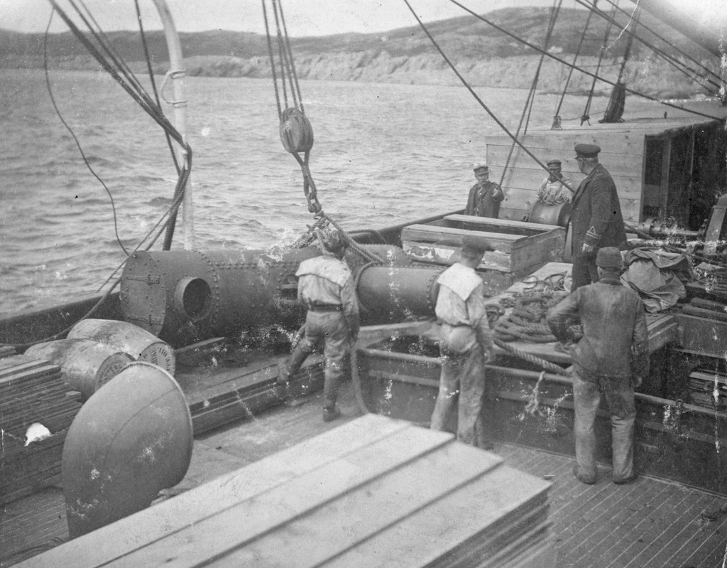 In 1898, Keeper Edouard Fontaine built a new large bridge on the island using local assistance and material sent from Quebec City. The large bridge and five small bridges were needed to span gulleys between the landing on the island and the lighthouse. In the fall of 1898, a new horizontal boiler for the fog alarm was sent to Cape Bauld. These pictures show the boiler onboard the vessel, being hoisted off the deck, being lightered ashore on two surfboats, and then being hauled across the island.