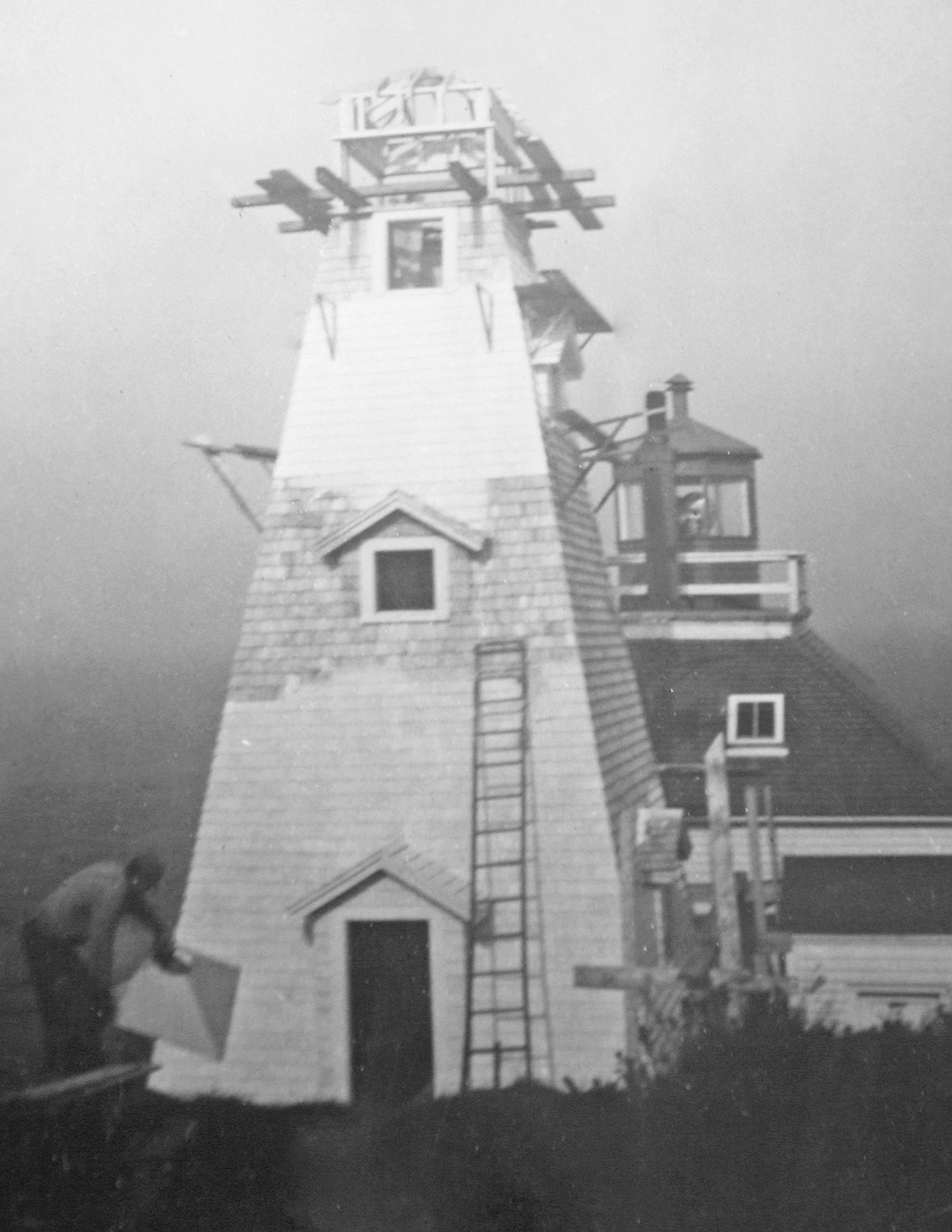 The current white, wooden, pepper-shaker-style lighthouse that stands 10.7 meters high with a red roof and flashing white light was built in 1957. The foundation of the original light is still visible. Angus Smiley, the station’s final keeper, transferred to Machias Seal Island when Boar’s Head Lighthouse was destaffed in September 1987.
