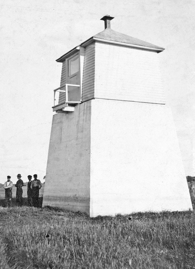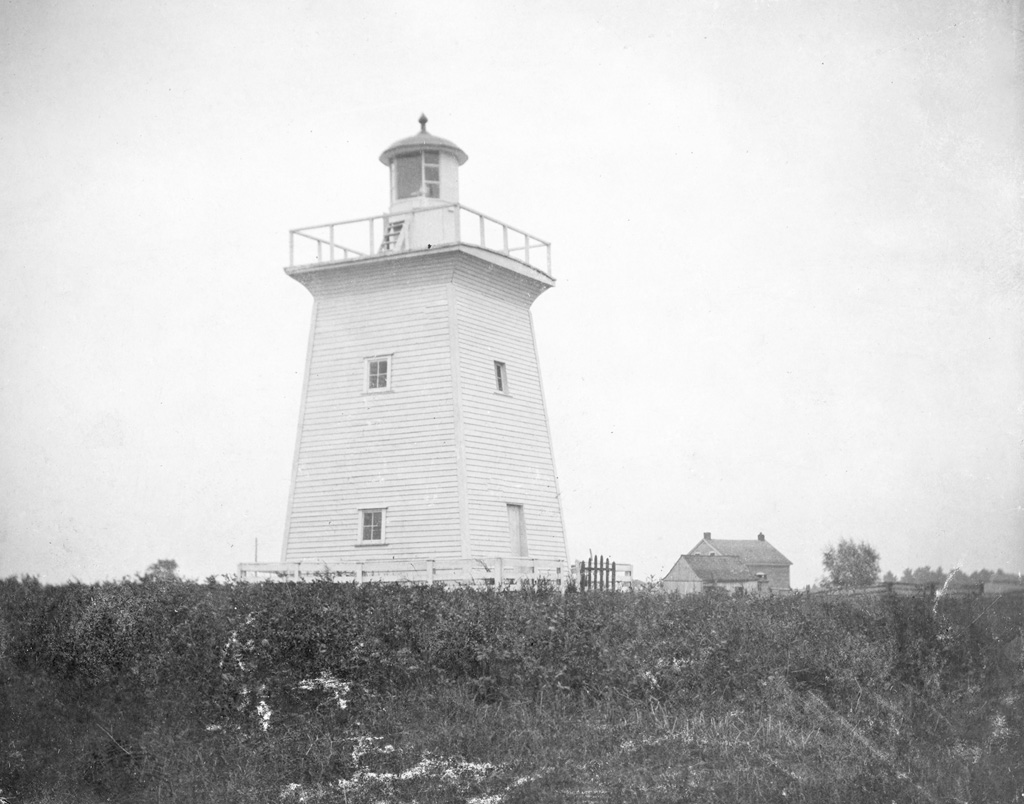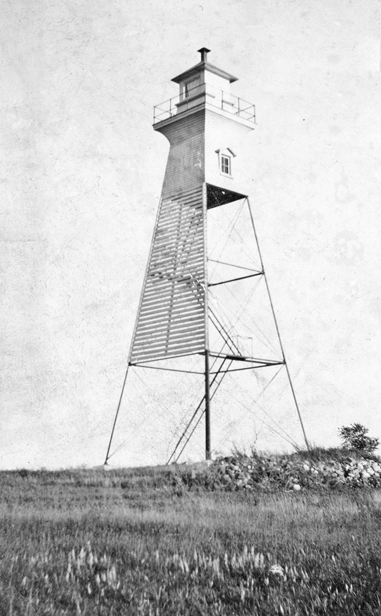 The front tower stands on ground about 450 feet back from the water’s edge. It is distant about 2 1/8 miles above Contrecoeur church, and is opposite the lower end of Ile Bouchard.The tower is a square, wooden building, with sloping sides, painted white. It stands on a whitewashed concrete pier. The tower is 12 foot high and the pier 15 feet high.