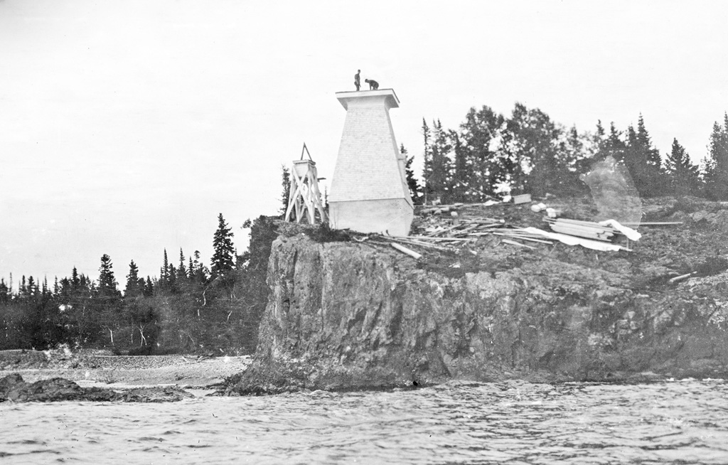 On the night of September 15, 1908, the light from a permanent lighthouse was exhibited on Coppermine Point, and the open-frame, pyramidal tower topped by a lantern was removed. The new Coppermine Point Lighthouse was a wooden building, square in plan, with sloping sides and surmounted by an octagonal iron lantern. The tower measured thirty-two feet from its base to the top of the ventilator on its lantern and was erected under contract by J.C. Kennedy of Owen Sound for $1,200. A fifth-order French lens was used in the new lighthouse to display a light at a height of sixty-one feet above Lake Superior.