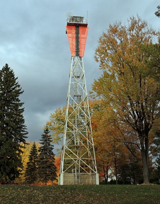 The lightship at No.2 curve in Lake St. Peter was removed from her station, and replaced by three permanent lights shown from towers standing on concrete piers, arranged as two ranges with the middle light common to both. This middle tower consists of a square fireproof dwelling painted white with a red roof, surmounted by an octagonal iron lantern painted red. It stands on a rectangular concrete white washed pier with battered sides and a pointed nose upstream. The pier rises 29 feet above the summer level of the river, and stands at the point where the axis of the widened channel from Yamachiche curve to No.2 curve cuts the axis of the widened channel from No.2 curve to No.1 curve. The lighthouse is 28 feet high from the deck of the pier to the ventilator on the lantern, and the light is a fixed white dioptric acetylene light of the fifth order, elevated 49 feet above the water, visible 6 miles. The back lights are similar lights elevated 94 feet above the water and visible 6 miles. Each is shown from a skeleton steel tower, rising from the walls of a fireproof dwelling, standing on a square concrete pier with battered walls. The tower is surmounted by an octagonal iron lantern, the lantern and skeleton framework being painted red, and the dwelling and pier white. The pier rises 29 feet above the water, and the tower is 73 feet high from the pier to the ventilator on the lantern.