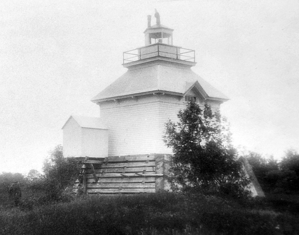 This is a temporary fixed white light, triangular lantern, mammoth flat-wick, placed on top of a frame to indicate the point, and is in charge of C. Brunelle. At the request of Captain Nelson, with the permission of the Department, I removed this light two acres back to high water mark on the point clear of the trees, and sent up a new frame work, consisting of three poles, about thirty feet high, upon which a triangular lamp is placed, being at least ten feet higher than formerly. The frame work is painted white, and owing to the action of the ice, will have to be removed to a distance of about one mile at the end of the season. A small building, which is easily removed, with the use of a stove, was secured for the shelter of the keeper, for which six dollars is to be paid for the season. The keeper’s salary has not yet been fixed.This “temporary” light served for nearly twenty years. In 1891, land on the point was purchased and plans and specifications were prepared for a small tower on a pier. Tenders for the work were invited in the spring of 1892, and a contract was awarded to F.A. Verrette of Three Rivers to erect the lighthouse for $1,675. The light was placed in operation on September 14, 1892 and the following information on it was subsequently published: