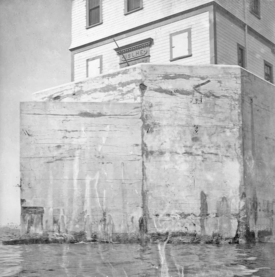 Because of repeated damage, in March 1911 Congress appropriated $25,000 for rebuilding and improving the station on the present or an adjacent site. Wisely, the new dwelling and fog-signal building were placed on nearby Lincoln Island, about 1,650 feet east of the original site, while just the light remained on the more exposed rock. The new station was activated on October 10, 1912, but the work continued into 1914 and cost $24,774. The new flashing acetylene light was shown from the top of a brown square, pyramidal, skeleton steel tower, surmounting a large concrete base.