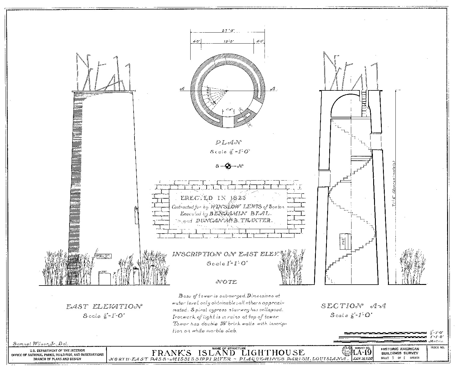 A marble plaque inscribed with the names of the contractor and builders of Frank’s Island Lighthouse along with the year of completion was prepared for the original structure. After the year was updated, the marble slab was embedded in the brick walls of the 1823 tower.
