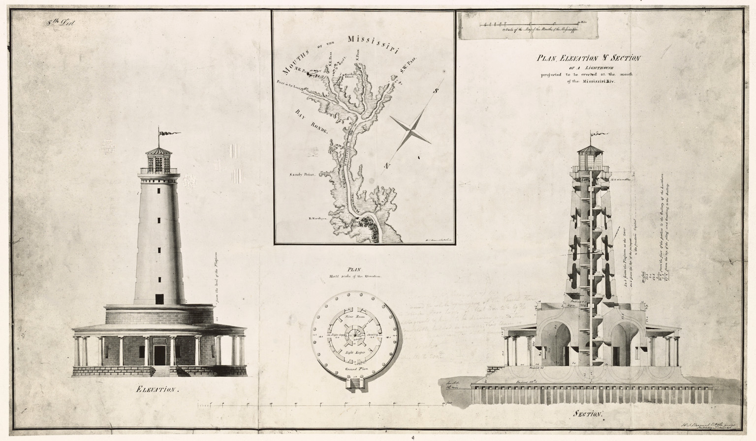 The government chose Latrobe’s elegant but impractical plan and advertised for construction bids in 1807. Contractors recoiled. The advertisement described the building in minute, bewildering detail: a giant stone tower perched on an experimental foundation of inverted arches, flying buttresses, and radiating walls; a grand marble staircase within; and a circular colonnaded dwelling encircling the lighthouse itself. The proposed palace would rise from a bank populated by snakes, alligators, and clouds of mosquitoes on an island inelegantly named Frank’s Island.