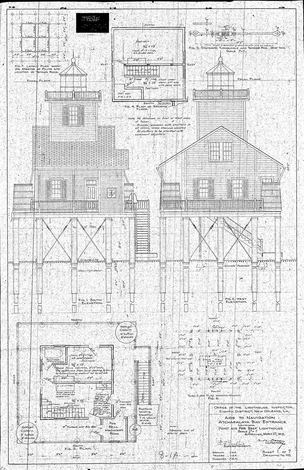 To aid navigation in foggy conditions common in winter and early spring along Louisianas coast a 1,000-pound bell was installed on the main platform, mechanically struck once every twenty seconds. Quarters for three keepers were integrated into the light stations structure, with a kitchen/living room, bedroom, bathroom, and a room for the fog-signal machinery on the first floor, and two additional bedrooms on the second floor. Elevated walkways connected the main station to support buildings and the wharf where supplies were delivered by tender.