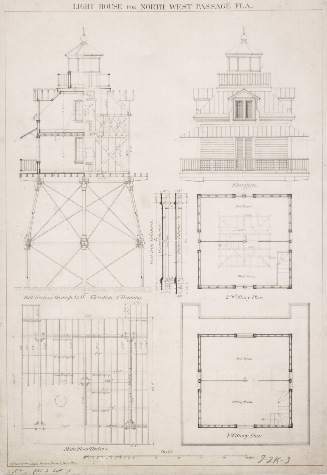 The foundation consisted of five wrought-iron piles driven into the coral seabed through cast-iron disks four feet in diameter. Twelve-inch yellow pine spars formed a secondary framework above the iron piles, supporting the keeper’s dwelling. The frame house was topped with a galvanized iron, fireproof roof and an iron lantern room.