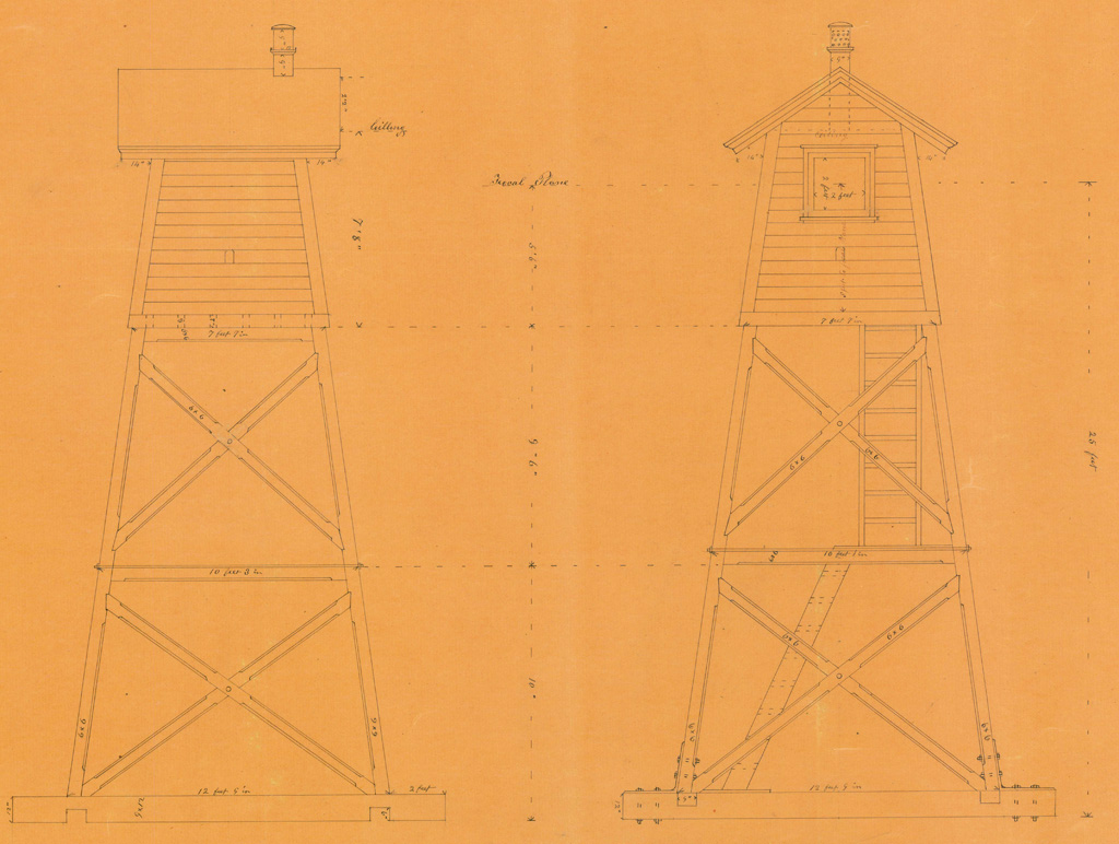 In 1868, a new keeper’s dwelling—set on eleven wooden piles driven to a depth of twenty-eight and topped by a short tower and lantern—was compelted. The foundation piles were cut off below the surface of the marsh and iron cylinders were used to link the piles to the dwelling’s sills. A movable skeleton-frame front beacon was built on a 100-foot tramway, allowing adjustments as the channel shifted. The lights were first exhibited again on October 10, 1868.