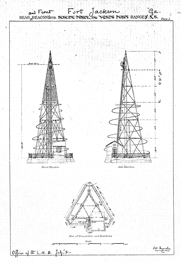 Like the other Savannah River ranges, the Fort Jackson lights were iron-framed structures with keeper’s quarters below and lanterns hoisted by machinery. The rear light stood approximately eighty feet tall, while the front light rose to about forty feet. When aligned by mariners, the two lights formed a precise visual corridor marking the safest path through the channel.