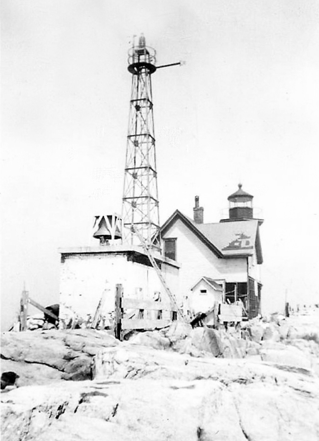 To protect the new station from heavy seas, a substantial bulkhead ninety feet long was constructed from heavy pine timbers bolted directly to the rock and reinforced with stones salvaged from the demolished masonry dwelling.