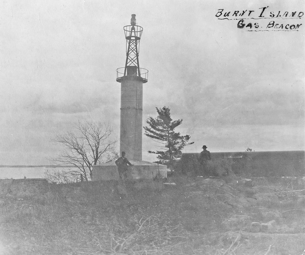 Burnt Island Lighthouse was placed on the southeast point of the island and consisted of a square, wooden, tower that stood twenty-six feet tall and exhibited a fixed white light at an elevation of sixty-four feet above the river. Three lamps and two reflectors were initially used in the lantern room, which had a diameter of three feet, to produce the light.