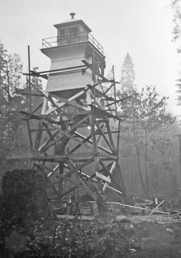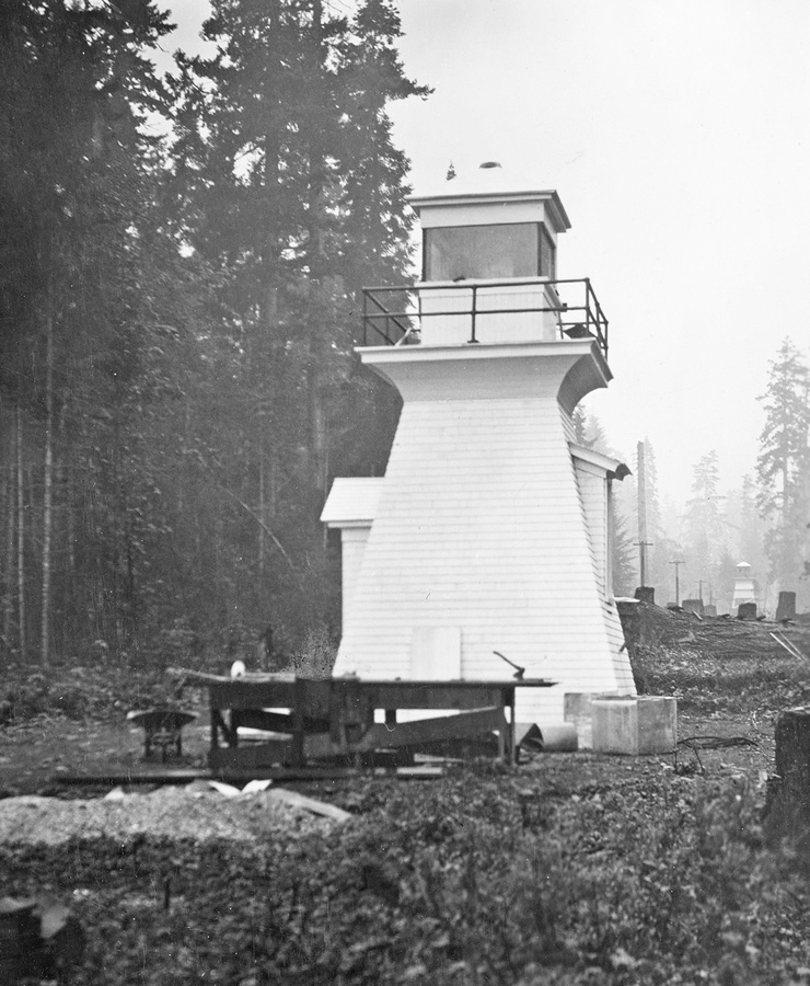 In 1915, the Department of Marine paid $167.35 to purchase the sites for range lights to replace the St. Andrew’s crosses. W. H. P. Trowsdale supervised the day labour that constructed a set of wooden range towers that year at a cost of $2,756.39. The front tower stood on the western shore of Baynes Sound, twenty feet back from the water’s edge, and displayed a fixed white light from a fourth-order lens. The rear tower was positioned 1,000 feet inland from the front tower and showed a fixed white catoptirc light. The front tower was square in plan with sloping sides and was capped by a square lantern room. The rear tower was also square in plan with sloping sides but its base was open frame surmounted by an enclosed watchroom and square lantern.
