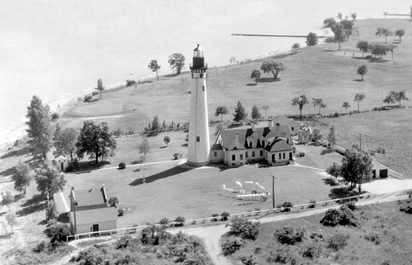 A wharf, topped by iron rails, extended 103 feet into Lake Michigan from the station, and its outer end was protected by a twelve-foot-square crib equipped with two boat davits. Though the station was accessible by road from Racine, the keepers were supplied a boat, which was stored atop a trolley in the station’s boathouse at the western end of the wharf. The keepers put their boat to good use in helping mariners, who encountered difficulties off Wind Point. Keeper Henry R. Bevry, whose tenure from 1913 to 1945 was the longest of any had keeper at Wind Point, went to the aid of numerous people. In 1914, he and his two assistants saved the motorboat Jeanette in rough seas. In 1918, Bevry and an assistant rendered aid to the auxiliary cruiser Driad that was grounded on a reef, and in 1921 Bevry and his assistants rescued two boys on a draft that were blown out into deep water.