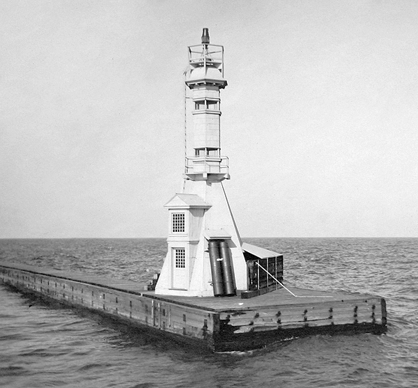 In 1902, while the Lighthouse Board was waiting for funding for a new breakwater light, metalwork was delivered to Milwaukee, and the post light at the southern end of the breakwater was enclosed in a white, hexagonal structure. Work on this new lighthouse, “a white pyramid, surmounted by a shaft, having two glazed belts forming the lanterns, surmounted by a dome,” was completed in October, and its lights were activated on the twenty-fourth of that month. The upper light was shown at a focal plane of forty-and-a-half feet and the lower light at thirty-two feet.