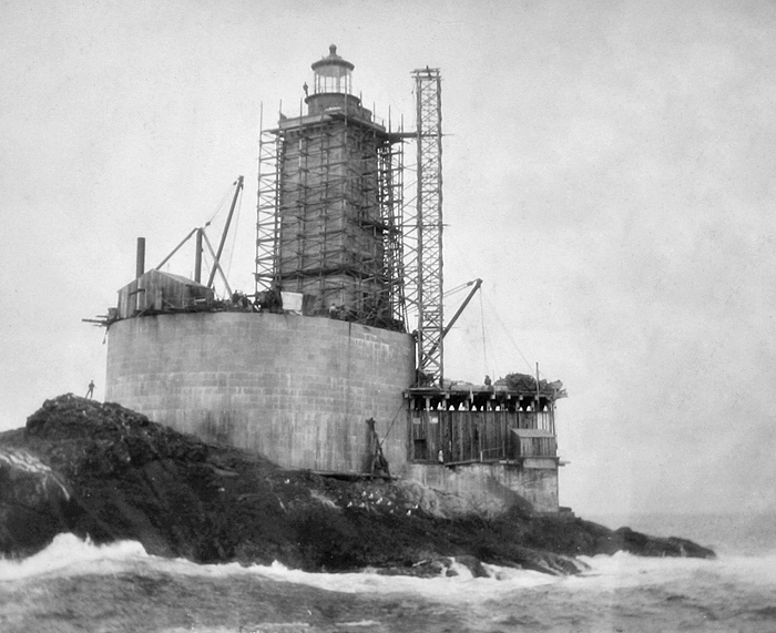 The final appropriation, which brought the total cost of the lighthouse to $721,000, came late in September 1890, which prevented any work being done that year. The next spring, the crew returned to the rock, and the first stone for the lighthouse tower was set in place on May 13. By the end of August, the tower was complete, and the rest of the work season was spent removing the scaffolding around the tower, completing the interior, and installing the lantern room and spiral staircase supplied by the Phoenix Iron Company of Trenton, New Jersey.