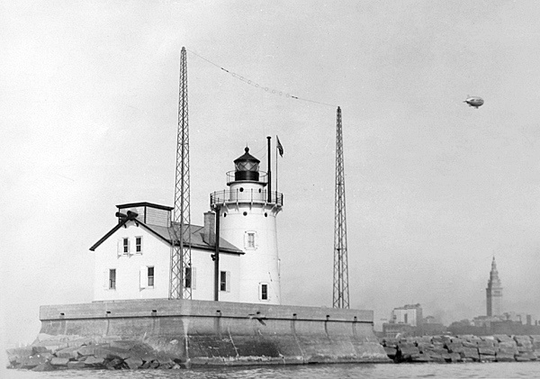 The fog signal was evidently quite audible as Clevelanders soon became annoyed by the blasts of the whistles. To appease the city’s residents, the characteristic of the fog signal was changed to just one three-second blast per minute instead of two, and a reflector was placed around the whistle to direct the sound seaward. In 1903, a twenty-foot-tall, wooden, octagonal substructure was placed beneath the iron tower on the west breakwater to raise its focal plane.
