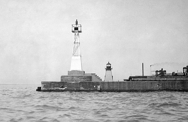 In 1900, a new tower was erected on the recently completed west pier, which had been rebuilt using concrete. This unique wooden tower stood nearly fifty-three feet tall and consisted of a cylinder above a cylinder of greater diameter. The bottom cylinder was covered in corrugated iron and painted red, while the upper cylinder was shingled and painted buff. On June 7, 1917, the steamer J. C. Morse struck and destroyed the cylindrical tower on the west pier while being towed by two tugs. The owners of the tugs paid for a new steel, skeletal tower mounted atop a concrete base. A steel, skeletal tower also replaced the wooden tower on the east pier in 1936.