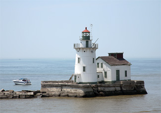 Breakwaters were eventually added parallel to Cleveland’s waterfront to provide a large protected outer harbor, and a gap between the western and eastern breakwater permitted vessels to easily access the Cuyahoga River. The western breakwater was built between 1876 and 1883, while the eastern breakwater was under construction from 1888 to 1893. A forty-foot-square pierhead was constructed at the eastern end of the west breakwater in 1884, and the following year an octagonal iron tower, transferred from the west pier at Charlotte-Genesee, was placed atop the pierhead. The tower was painted brown and first displayed its flashing red and white light on October 20, 1885, using a Barbier & Fenestre, fourth-order Fresnel lens manufactured in 1884. The fog bell formerly used on the nearby west pier was suspended from a bracket on the north side of the breakwater tower. A boathouse was built on the western side of the pierhead, and a cupboard and bunk were placed inside the tower in case the keeper became stranded at the breakwater.