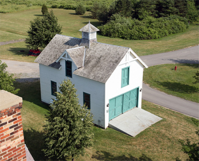 In 1934, the Delavan Construction Corporation of Buffalo was contracted to build a yellow-brick foghorn building and an addition to the east end of the dwelling. Municipal electricity was extended to the station at this time, allowing a 500-watt light bulb to replace the kerosene lamp being used inside the Fresnel lens and a thirty-two- horsepower electric motor to power the air compressor that energized the diaphone horns protruding from the north side of the fog signal building. Concrete shore protection was also added to the station during the construction of the fog signal building.