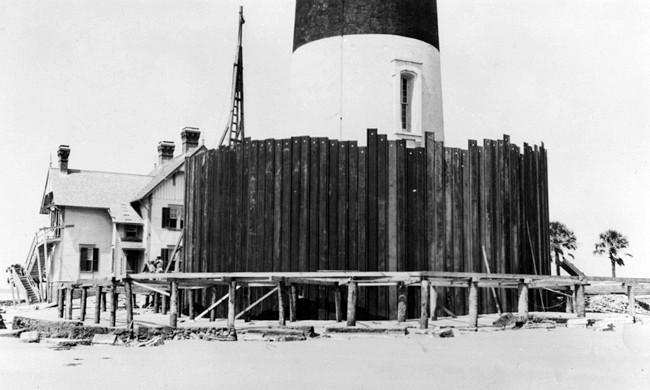 In 2008, the first phase of a restoration plan was completed. The work included the installation of a cofferdam that was sunk thirty feet into the seabed and projects about fifteen feet above the water at low tide. The interlocking, Z-shaped beams are protected by riprap that prevents the current from scouring out the sand beneath the cofferdam. The next phase of the project, which included jet-grouting the foundation, filling the inside of the cofferdam with sand and a concrete cap, and installing new concrete piles under the foundation, was completed in 2010.