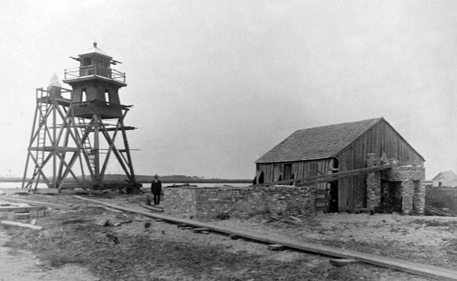 After Congress provided funds, a site for the new Charleston Main Light on Morris Island was selected at a location 1,700 feet northeast of the rear beacon on the island. A storehouse and quarters for workers were built on the island along with a wharf for landing material and a railway for transporting material from the landing to the construction site.