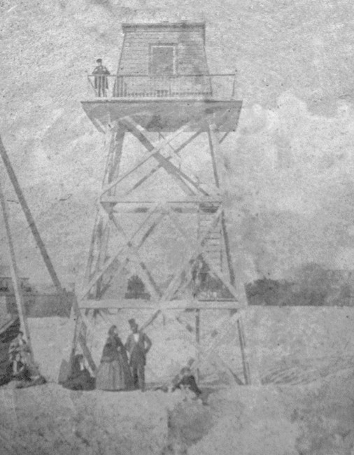 The 163-foot-tall triangular lighthouse is not the first to be built on Sullivan’s Island. Records indicate two “pole-beacon lights,” that were raised each evening and lowered the following morning, were placed near the southern end of the island near Fort Moultrie in 1848 to guide mariners over Charleston Bar. After being rebuilt in 1855, each of the beacon lights, which together were known as Sullivan’s Island Beacons, consisted of two lamps and stationary reflectors exhibited from enclosed lanterns set atop open wooden frames. In 1857, the rear beacon was consumed by fire and promptly rebuilt.