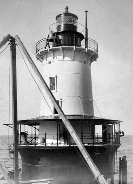Although Hooper Island Lighthouse was one of only four Chesapeake lighthouses erected during the twentieth century, it was still not quite modern enough to escape the necessity of human keepers and all of the expensive amenities and equipment required by them. A four-story tower, topped with a watchroom and lantern room, was thus built on the foundation to house the keepers and the station’s equipment. The foundation cylinder has a diameter of thirty-three feet, and as the tower’s diameter was only eighteen feet at its base, there was room for a covered gallery around the first level of the tower. A fourth-order Fresnel lens, manufactured in 1888 by F. Barbier & Company of Paris, was installed in the lantern room and exhibited for the first time on the night of June 1, 1902. A fog bell, manufactured by McShane of Baltimore in 1901, was mounted on the watchroom gallery, where it was alternately struck a single and double blow every twenty seconds during thick or foggy weather.
