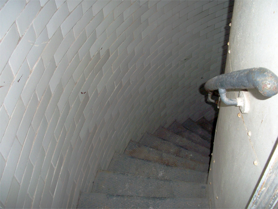 The tower’s first level served as the station’s kitchen, and still has parts of an old cabinet that once contained a sink, which drew water upwards from the cistern in the cellar. The second, third, and fourth levels contained office, bedroom, and living space for the keepers. The second and third stories have three windows each, while five circular, porthole windows provide light for the fourth level. For the bottom four levels, the tower is lined with bricks whose faces were glazed white to provide a smooth finish.