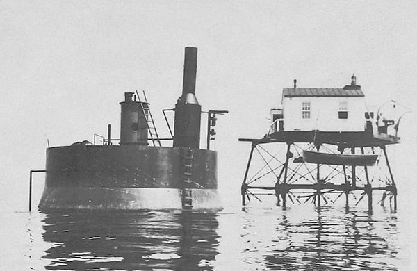 On October 15, 1872, Thimble Shoal Lighthouse’s fourth-order light, which exhibited a fixed light varied every thirty seconds by a red flash, was shown for the first time, officially replacing Willoughby Spit Lightship, the last remaining lightship in the district. Located a mere three-and-a-half miles from Old Point Comfort Lighthouse, the screwpile lighthouse consisted of a wooden, hexagonal cottage, built at the depot at Lazaretto Point in Maryland, that rested on the foundation piles and was surmounted by an iron lantern room. Fog bells placed on the north and south sides of the dwelling were simultaneously struck every five seconds by machinery during periods of low visibility.