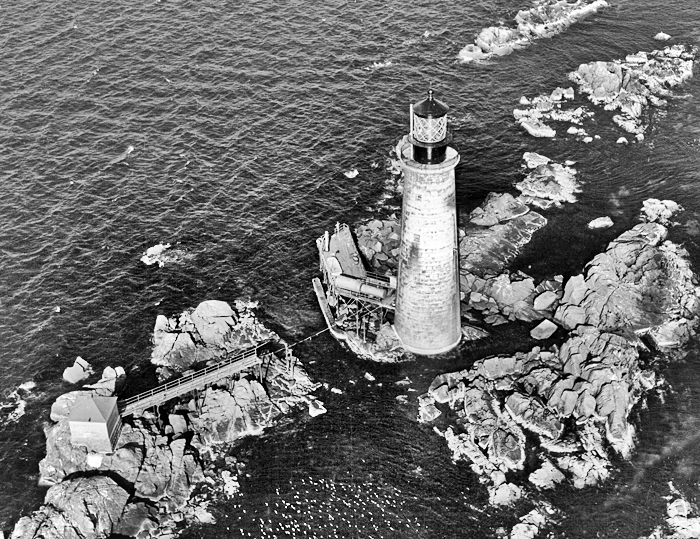 In December 1916, First Assistant Keeper Harry Whin was alone at the lighthouse, waiting for provisions and his relief, which were several weeks late, when a gale hit. With winds topping 100 mph, snow and sleet, then rain and fog, he kept the foghorn sounding and the light lit around the clock. A water pump, situated at the end of the wharf and used to cool the oil engines, kept freezing, requiring Whin to clamber down the ladder and thaw it out. Five days and nights this kept on, with the keeper having nothing to eat but fish. Whin later wrote historian Edward Rowe Snow about the end of this exhausting episode: