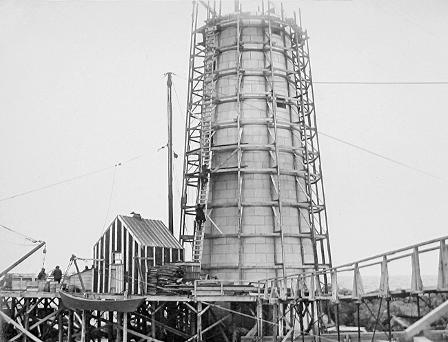 Work began on June 1, 1903, and by the end of that month, a wharf and temporary quarters were built on nearby Lovells Island. After timber bulkheads had been built on the ledge to protect the workers, a landing stage along with a platform to support a hoisting engine, derrick, and materials were erected. A shanty for the workmen was then built on the highest rock in the group and linked to the construction site by a ninety-foot-long walkway. The shanty had quarters, a messroom, and kitchen for thirty men, and beneath it a cold-storage cellar and a blacksmith shop were housed in chasms in the rock. The workers would live in the shanty during the summer so no time was lost in getting to and from the construction site.