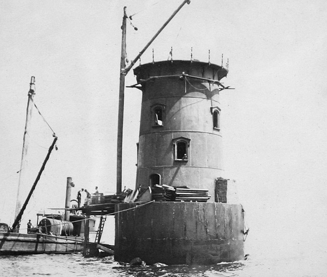By 1870, the foundation of the granite tower on the west side of the shoal had settled, after being undermined by the sea, and some of the joints in the masonry had opened up from three to four inches, prompting Congress to provide $5,000 in 1871 to fill up the joints with concrete and protect the base with sheet iron and large granite blocks.