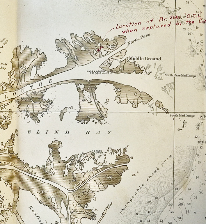 After reviewing the circumstances, the district superintendent concluded that the keepers had been negligent in their duties. In a letter to Coludrovich, he wrote that the keepers “must have been blind not to have seen the schooner in the bayou one mile away, or not to have seen her the moment she entered Pass a l’Outre.” The investigation also noted that a known rumrunner, Fred Jeanfreau—who was related by marriage to Coludrovich—had been operating in the area at the time, further raising suspicions. This map shows where the schooner was anchored in relation to the lighthouse.